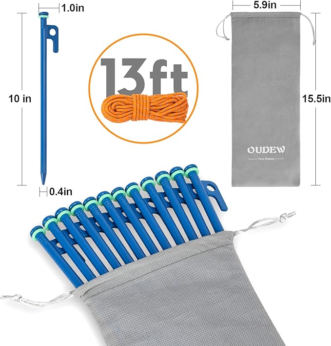- Upgraded Heavy Duty Tent Stakes: Set of 12 metal tent stakes - 10" in length and 2/5" in diameter. Made of high quality metal - sturdy, rust proof and will not bend. The best choice for those who like camping and being outdoors
