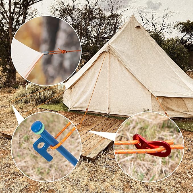 - Reflective Tent Rope with Aluminum Adjuster: The tent rope is made of high-quality nylon material, not easy to deform . Embedded reflective line for improved visibility. The adjuster makes it easier to adjust the elasticity and provides strong support