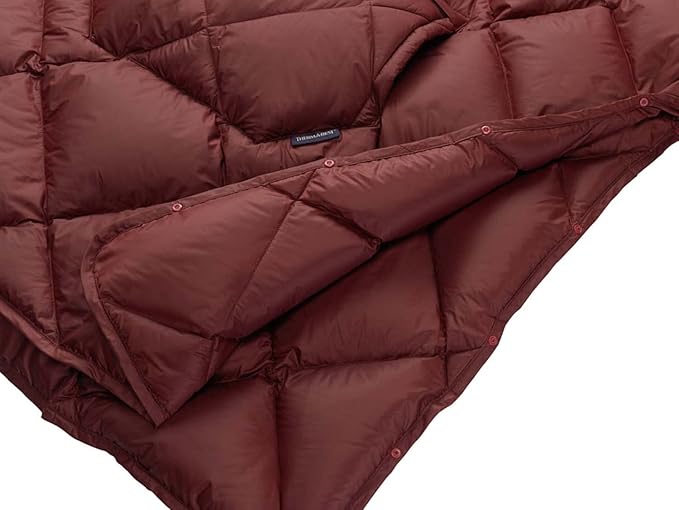 - Down-insulated hooded poncho that can be worn, or laid on the ground as a blanket