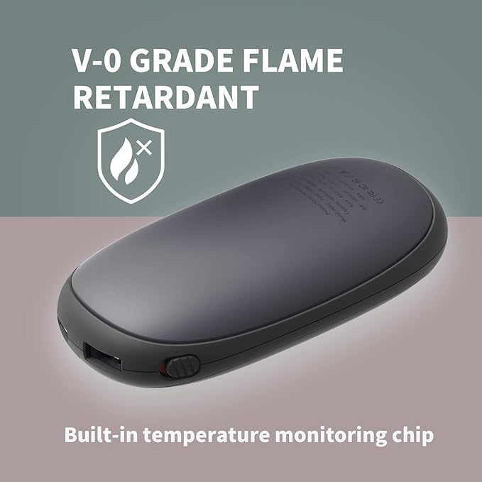 - No worries to use. The built in temperature monitoring chip constantly performs real time temperature monitoring. The built in temperature monitoring chip constantly performs real time temperature monitoring. The heated hand warmer frame is reinforced with the use of flame retardant V-O grade material, Acrylonitrile Butadiene Styrene ( ABS ), and polycarbonate ( PC ), for no worry use. frame is reinforced with the use of flame retardant V-O grade material,