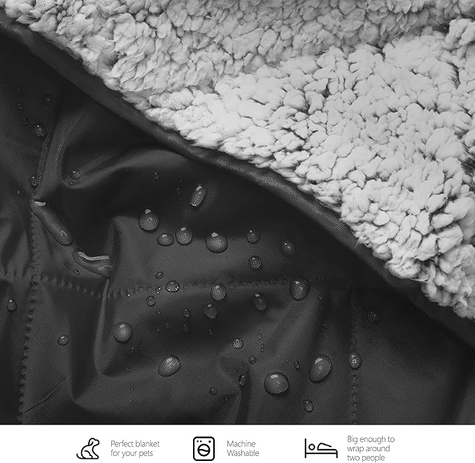 - ULTRASONIC QUILTING TO MAXIMIZE SAFETY: Our waterproof blanket uses ultrasonic quilting technology to stitch together the layers without leaving any holes, ensuring that the blanket is 100% waterproof. Ensuring that water won't seep through, making it perfect as an extra layer during winter when temperatures get freezing! Whether you're relaxing in the backyard, or camping out in nature's backyard - our warm and cozy outdoors Sherpa blanket will keep everyone dry and happy.