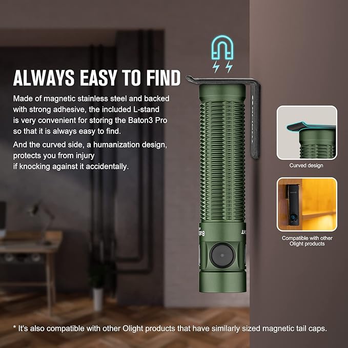 - [Convenient to Store] The L-shaped stand that is included with the flashlight makes it easier to store after use as it can be stuck anywhere
