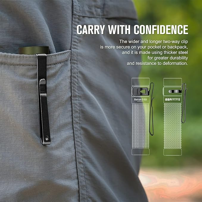 - [Two-way Clip] Designed with wider and longer two-way clip, the flashlight can stay securely in your pocket or backpack. It is made of thicker steel that is perdurable and resists deformation