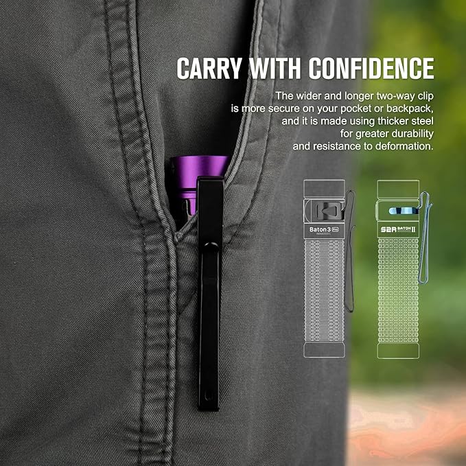 - [Two-way Clip] Designed with wider and longer two-way clip, the flashlight can stay securely in your pocket or backpack. It is made of thicker steel that is durable and resists deformation.