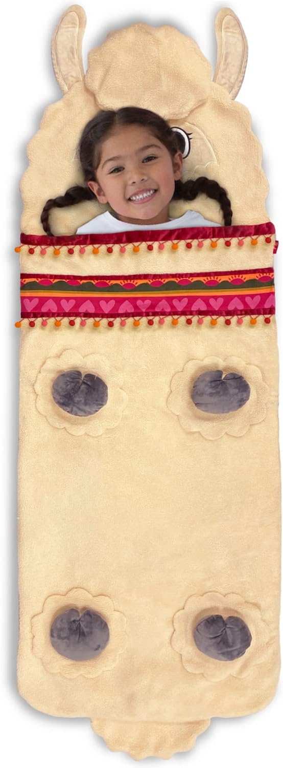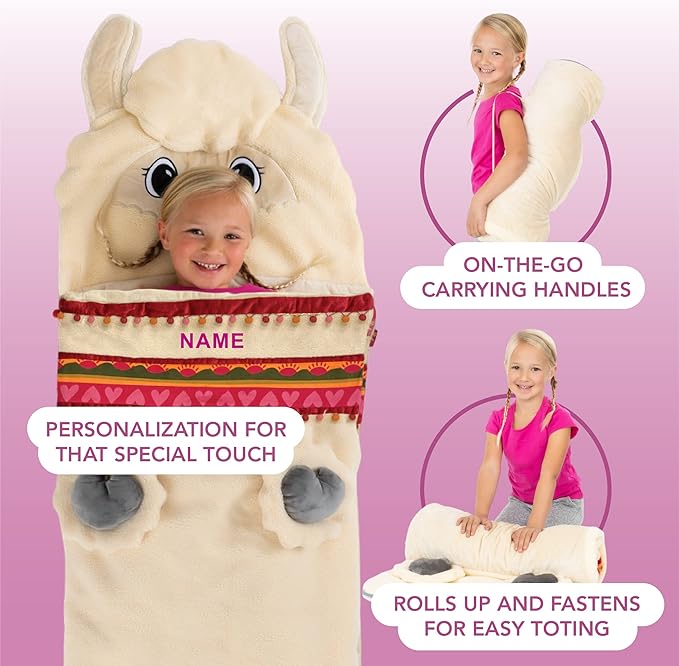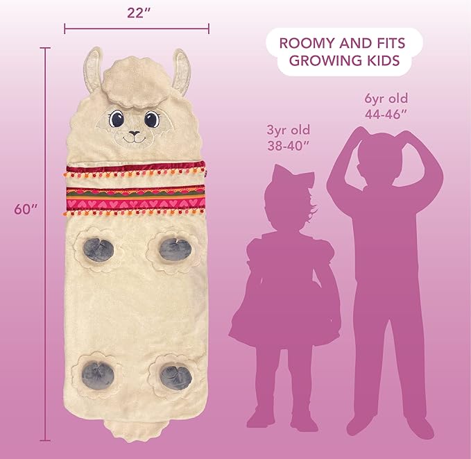 - ALPACA SLEEPING BAG for toddlers 3+ arrives dazzled in native indigenous inspired colors and patterns. Complete with furry fleece and colorful puffy pompoms these gentle friends are ready to transport any kiddo into dreamland. Fun dreamy adventures await! Machine washable.