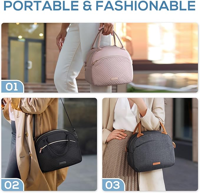 - 【Keep Your Foods Fresh】: The unique pinch angle design makes the lunch bag more three-dimensional and fashionable. The lunch tote bag for women has a removable adjustable shoulder strap and swivel snap buckle. Allows you to carry it the way you like, as a handbag, shoulder bag, or crossbody bag. Perfect as a gift for a lady's lunch box. Also great for work, and picnics.