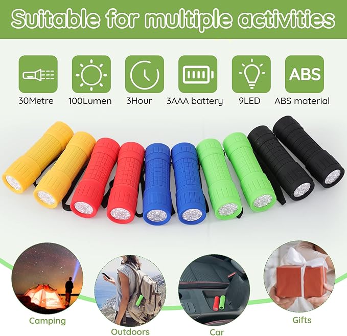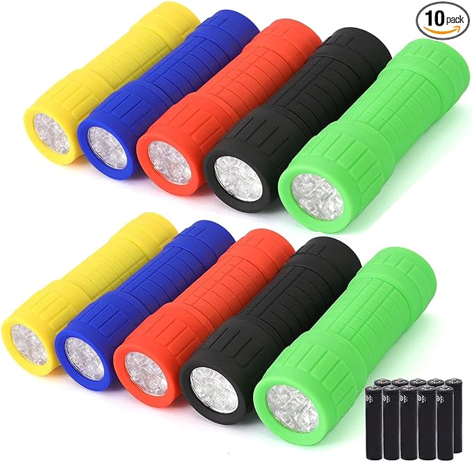 10Pack Mini Flashlights Set, 9-LED Small Flashlight for Kids, 5 Colors, with Lanyard and 30 AAA Batteries Included, Perfect for Night Reading Party Camping Hunting Emergency