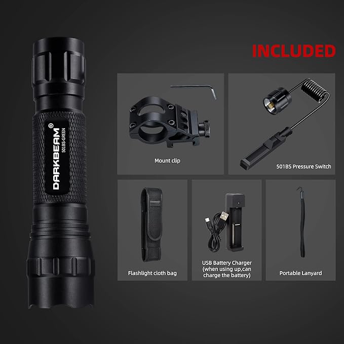 DARKBEAM Green Light Flashlight Tactical LED USB Rechargeable Zoomable Light Kit, Portable Mini Greenlight for Night Hunting, Observation, Fishing, Astronomy, Aviation, Rescue, with Clip