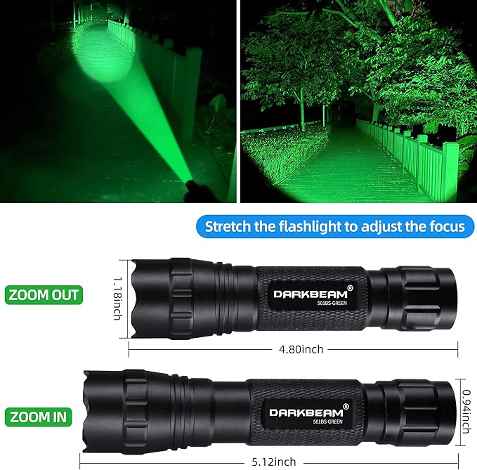 - 【KEEP NIGHT VISION FOR NIGHT】 -- Used advanced R5 LED, emits 500 lumens powerful GREEN light which animal's vision is not sensitive to. Different from white-light flashlights – With higher concealment, you will get a clear vision at night and observe the natural behavior of animals from a distance without spooking them. The green light is especially good for night hunting.