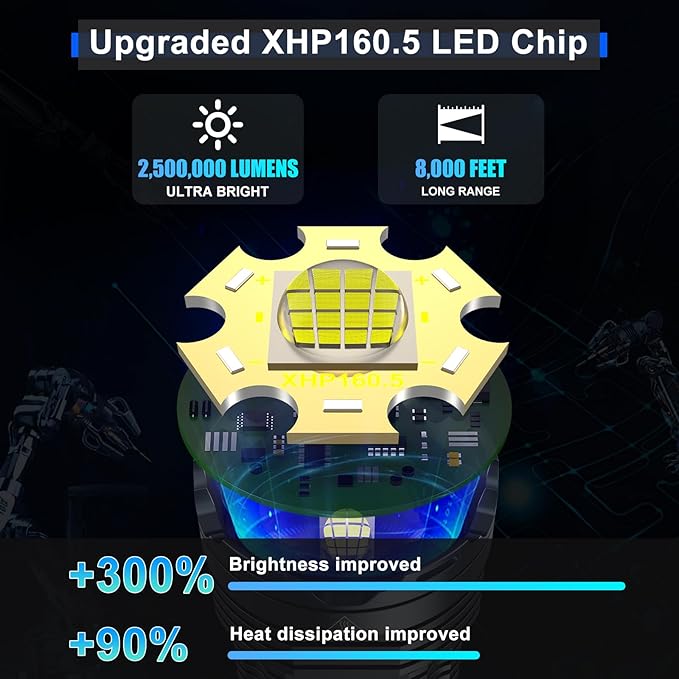 - 🌈【High Brightness, Long Range】The Gehavin high power flashlight features the upgraded xhp160.5 chip. This rechargeable flashlight produces up to 900,000 lumens of ultra-high output and is 300% brighter than older models. It can easily illuminate a 3000 square foot room or focus on objects up to 3500 feet away.