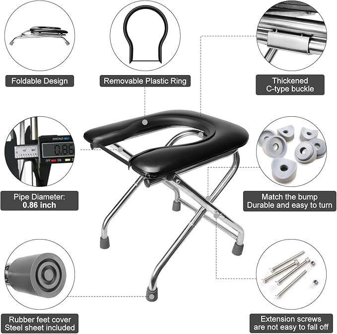 - 【350LBS Weight Capacity】Stainless steel portable toilet with soft seat, which has a stainless steel frame. This folding toilet seat only weighs 4.9 pounds, 4-legged frame supports up to 350 pounds capacity. Equipped with rubber feet which prevent slipping and better stability.