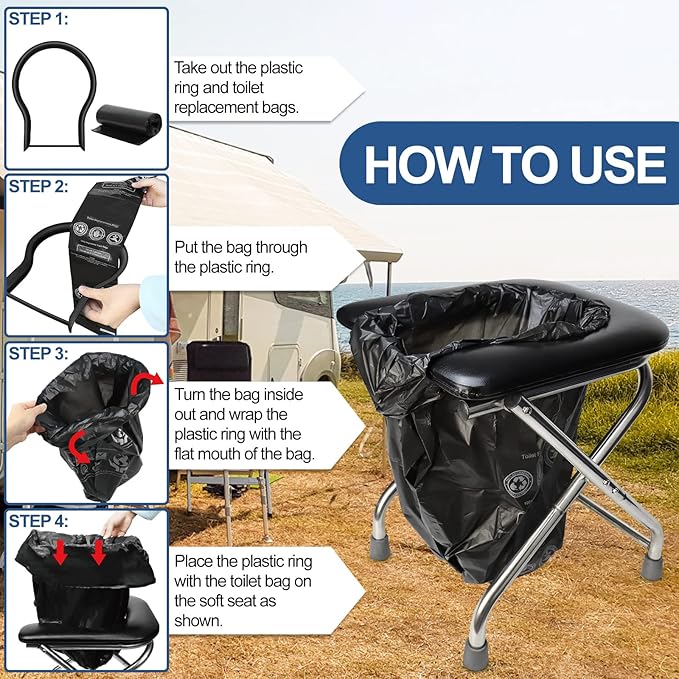 - 【Easy Cleanup & No Mess】BLIKA camp toilet is made of waterproof PVC leather, easy to clean. Place the plastic ring on the seat, toilet bags will be held in place by a removable plastic ring. BLIKA portable toilet is perfect to be accompanied with 8-gallon size toilet replacement bags. After using, rinse the seat with water or wipe with paper as needed to keep clean.