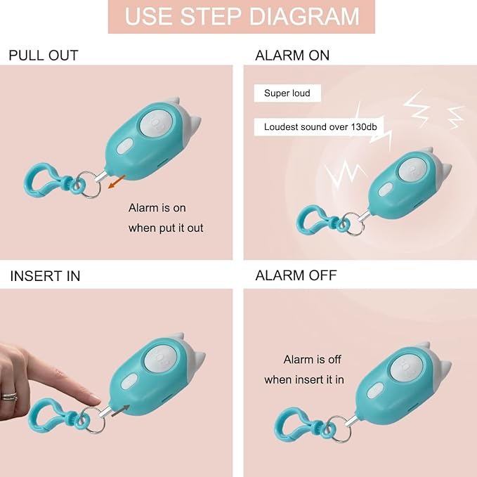 - Simple to use: Cute design is eay to ues.To activate, simply pull out the top pin.To deactive,replace it.The personal safety alarm can be used multiple times.