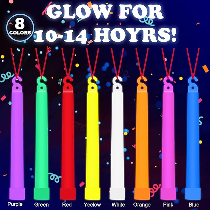 • 💡25 Glow Sticks Bulk Pack: Package contains 25 6-inch super bright glow sticks with red ribbons. Eight vibrant colors including green, yellow, blue, red, white, orange, pink, and purple will brighten up your glowing party.