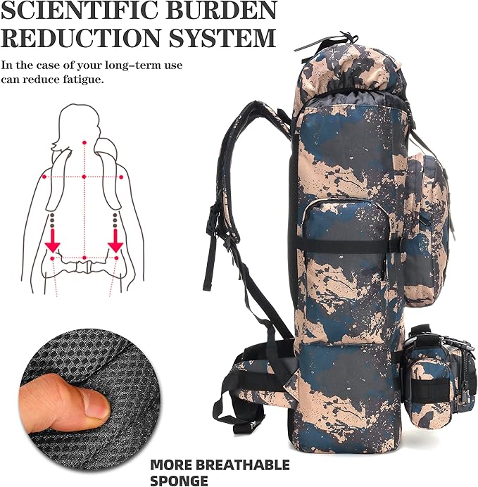 - Comfortable Breathable Waterproof Camping Backpack : The backpack 100l padded back filled soft mesh material and the 2 cm thick honeycomb foam , relieve the back stress and sweat less on the back.The backpacking backpack thick density Tear Resisten Oxford cloth fabric is waterproof and wear-resistant, and the texture is tough and odorless.
