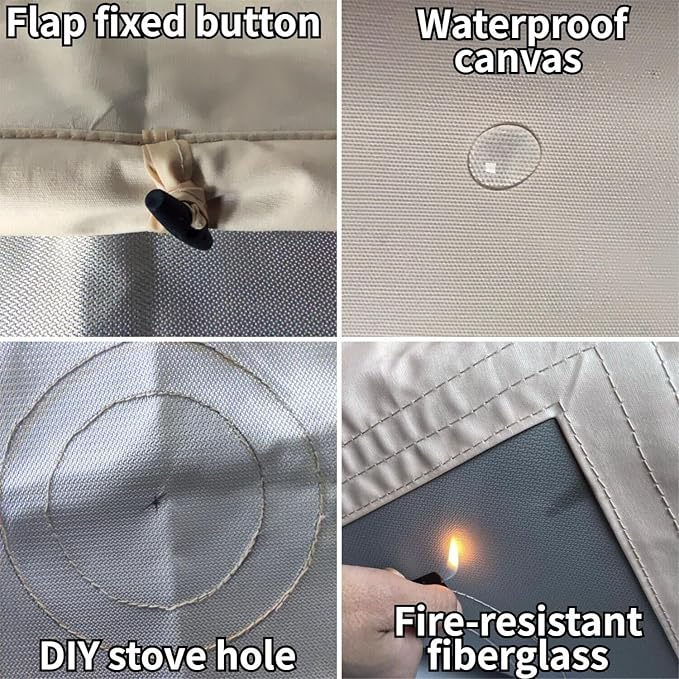 - FLAME-RETARDANT:Gray fabric-- High temperature resistance fiberglass with waterproof PU coating. keep working in a certain temperature range. Protect your tent fabric well when you use the stove.