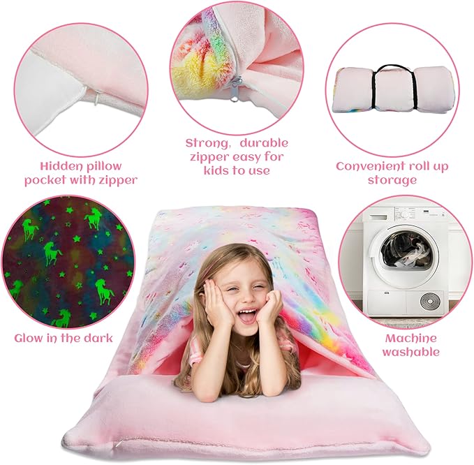 - SOFT WARM AND COZY - The kids sleeping bag is made of super soft and comfortable plush material to keep your little one extra warm. Whether they're napping, watching TV, sleeping overnight, camping,the warm glow in the dark nap mat will keep your little one warm and cozy all the time.