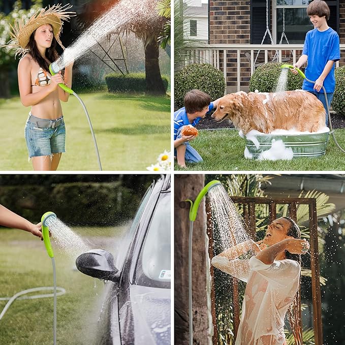 - PORTABLE CAMPING SHOWER: Suitable for INDOOR/OUTDOOR shower, Weighs only 25.2 ounce, easy to carry and store in luggage, backpack or car trunk. Perfect for outdoors camping, hiking, kid bathing, pet cleaning, car washing, plants watering, windows and backyard cleaning.