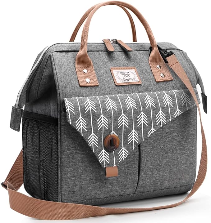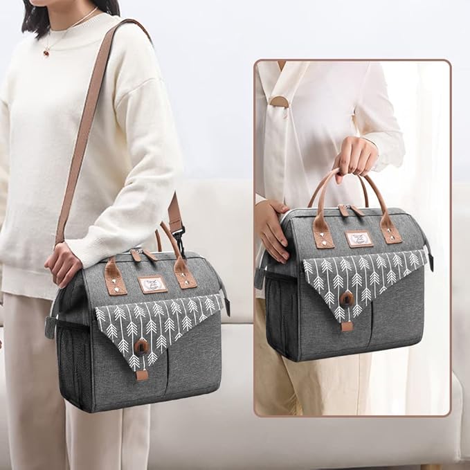 Lekesky Lunch Bag for Women Large Lunch Box Leakproof Cooler Purse for Adults, Cute Insulated Lunch Tote for Work, Lunchbag with Side Pockets and Adjustable Shoulder Strap, 15L, Grey