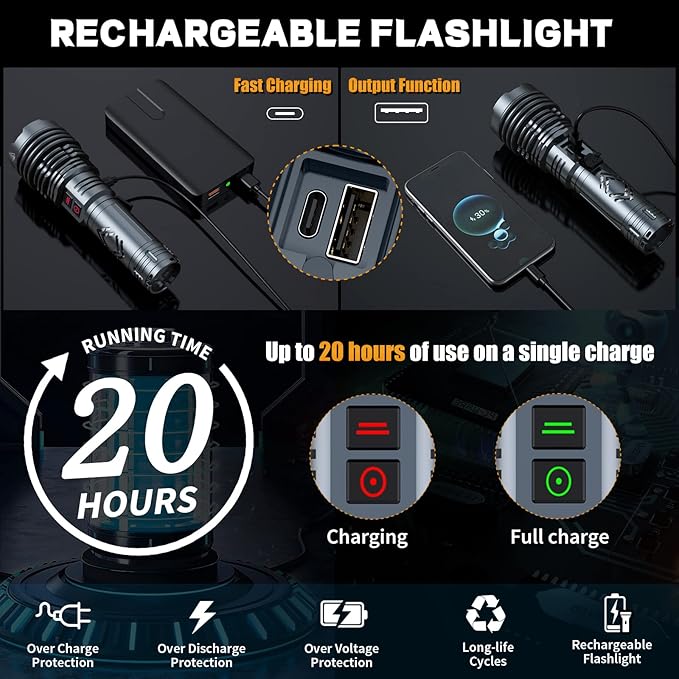 - 【POWERFUL BATTERY & USB RECHARGEABLE Flashlight】Built-in fast charging chip, twice as fast as the charging speed of ordinary USB Flashlight rechargeable. This high-power Flashlight can work about 8-20 hours on a single charge. With circuit protection, such as overcharge protection, over-discharge protection, over-voltage protection, short-circuit protection, etc., which can extend the life of the Flashlight high lumens rechargeable up to 200000 times.