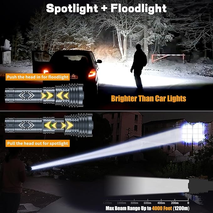 - Special Feature : 2024 Brightest Flashlight 1500000 High Lumens; 8000Ft Long Range Than Ordinary Flashlights, Rechargeable 5000mAh High Power Battery; Up to 24 Hours Runtime, Adjustable Strap; Non Slip Grip, Adjustable Focus Between Spotlight and Floodlight; Adjustable 6 Light Modes With One Super Bright Mode Than Other Flashlight, IP67 Waterproof; Weatherproof; Dustproof; Impact Resistant; Durable 2024 Brightest Flashlight 1500000 High Lumens; 8000Ft Long Range Than Ordinary Flashlights, Rechargeable 5000mAh High Power Battery; Up to 24 Hours Runtime, Adjustable Strap; Non Slip Grip, Ad… See more