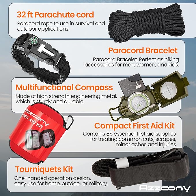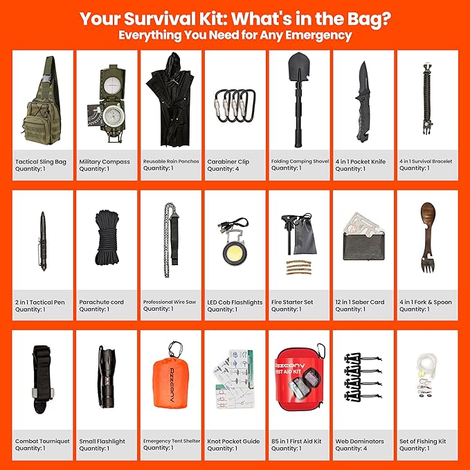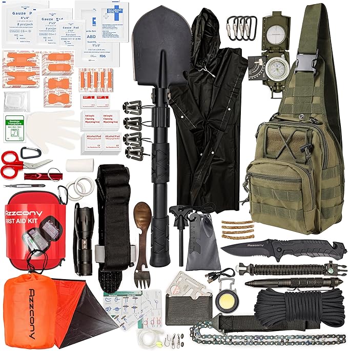 - Top Practical Survival Tools: All survival gear in this kit are essential, including a Multifunction Shovel, 12 in 1 Saber Card, 4 in 1 Survival Bracelet, Combat Tourniquet, 1 Set of Fishing Kit, Fire Starter, Modern Compass, Flashlight, Flashlights, Raincoat, Emergency Tent Shelter, First Aid Kit, Professional Wire Saw, Tactical Pen, 2 in 1 Fork & Spoon, 4 Web Dominators, 4 Climbing Hooks and more, which can meet your different needs.