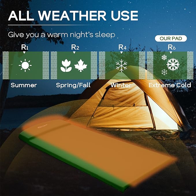 - Warm Camping Mattress Pad: With 3 inches of thickness and 6 R-value, our camping sleeping mat provides excellent insulation from the cold and damp ground as sleeping bag pad or camping cot pad, keeping you warm and comfortable throughout the night. Stay cozy and snug, even in chilly camping conditions.