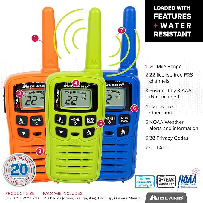 Midland – T10X3M X-Talker Two Way Radio – Water Resistant – NOAA Weather Alert Radios – 20 Mile Range - Multi Color Three Pack