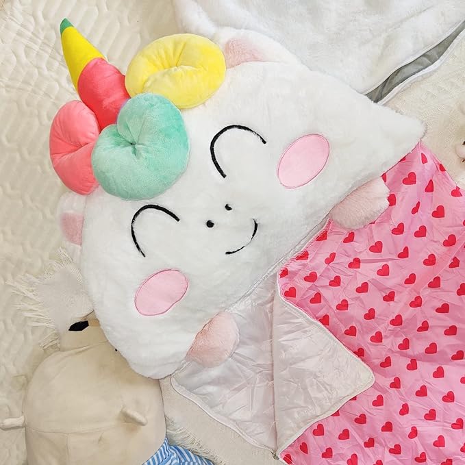 - Adorable Unicorn Design: Features a magical unicorn theme with a rainbow-colored sleeping bag and a plush pillow, perfect for kids who love fantasy and fun