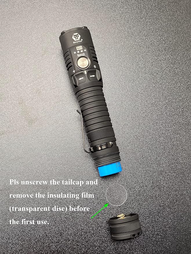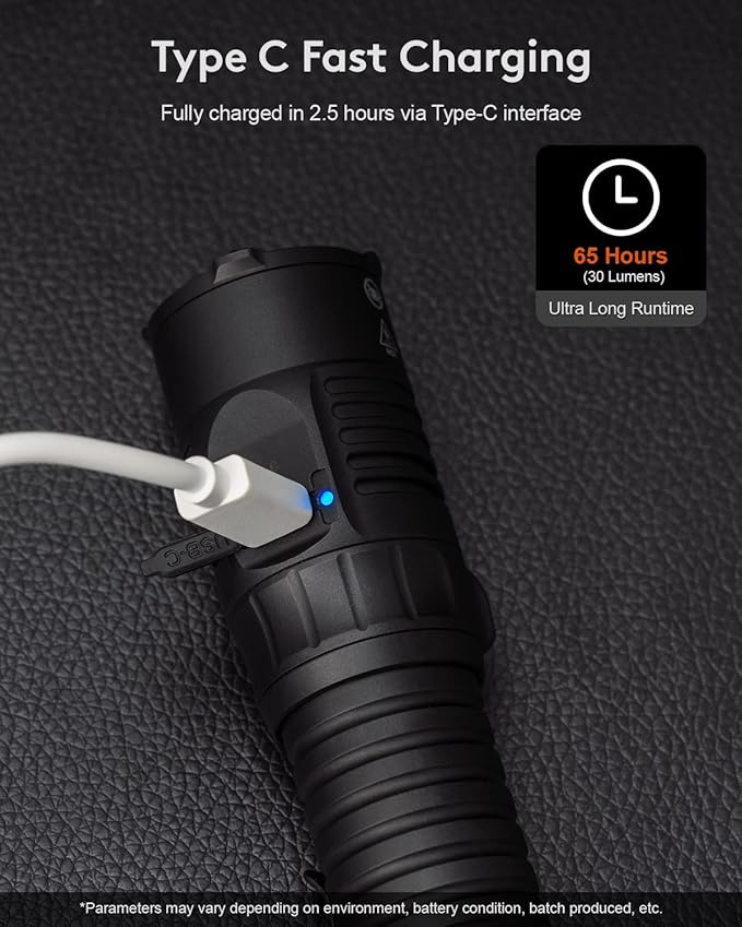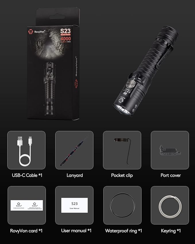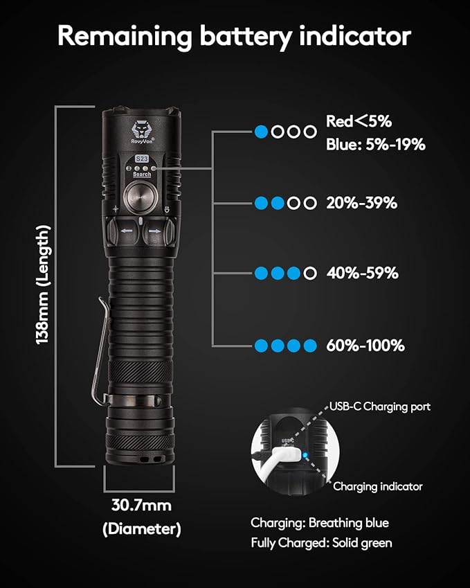 - Type-C Rechargeable Searchlight: RovyVon S23 led flashlight is powered by the replaceable high capacity battery, which is 5000mAh and can be fully charged in 2.5 hours via provided charging cable. The longest runtime of the powerful flashlights can be up to 65 hours. USB-C charging interface makes charging fast and easily nowadays. Always ready to go.