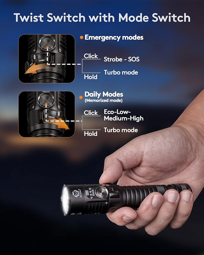 - Newly designed Twist Switch: The S23 searchlight keychain flashlight features with the rotary switch makes the flashlight stand out, with the large metal Mode switch making the user interface is easy and simple. Simply twist and press to get your lighting mode or brightness level.