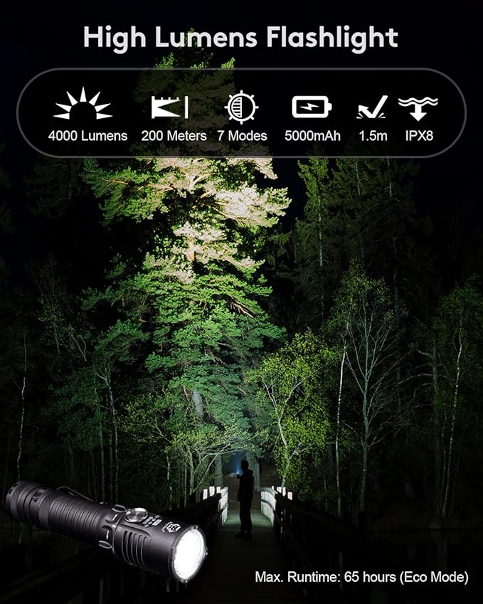 RovyVon S23 Search Flashlight, 4000 Lumens High Lumen Brightest Flashlight Long Throw Flashlight, 5000mAh Rechargeable Battery, IPX8 Waterproof EDC Flashlight Compact Duty Work Light with Lanyard