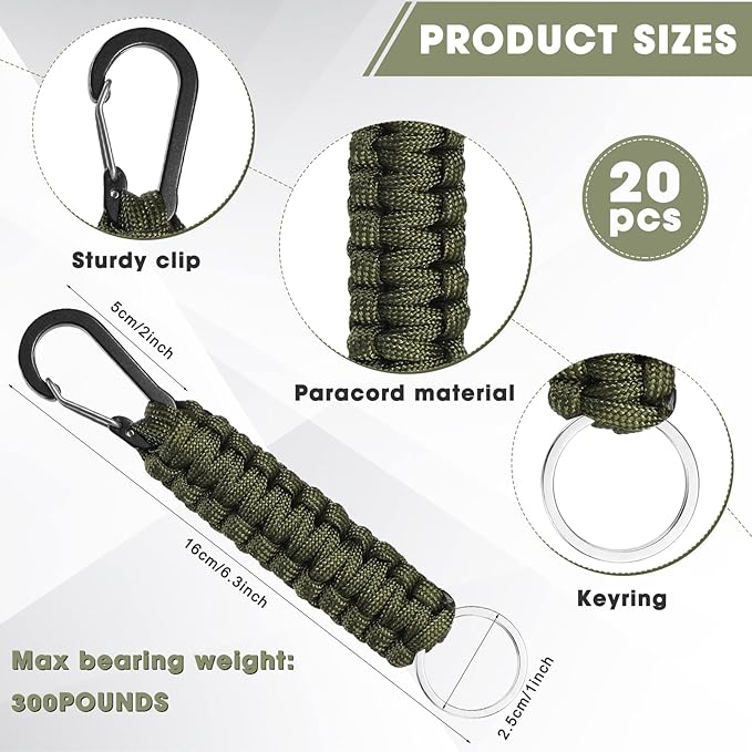 Fumete 20 Pcs Paracord Keychain Military Braided Keychain Clip with Strap Paracord Backpack Strap with Chain Hooks for Women Men Camping Fishing Hiking Backpacking Keys Hanger, 5 Styles