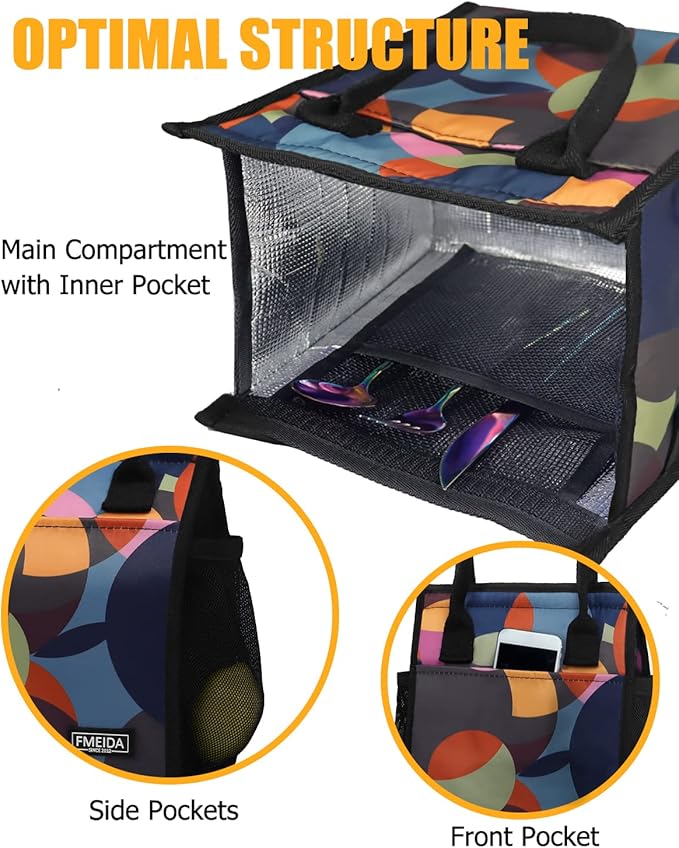 Fmeida insulated Lunch Bag Women, Thermal Lunch Tote Bag, Reusable Lunch Box Bags for Women Lady | Front&Side&Inside Pockets, Small Colorful Circle