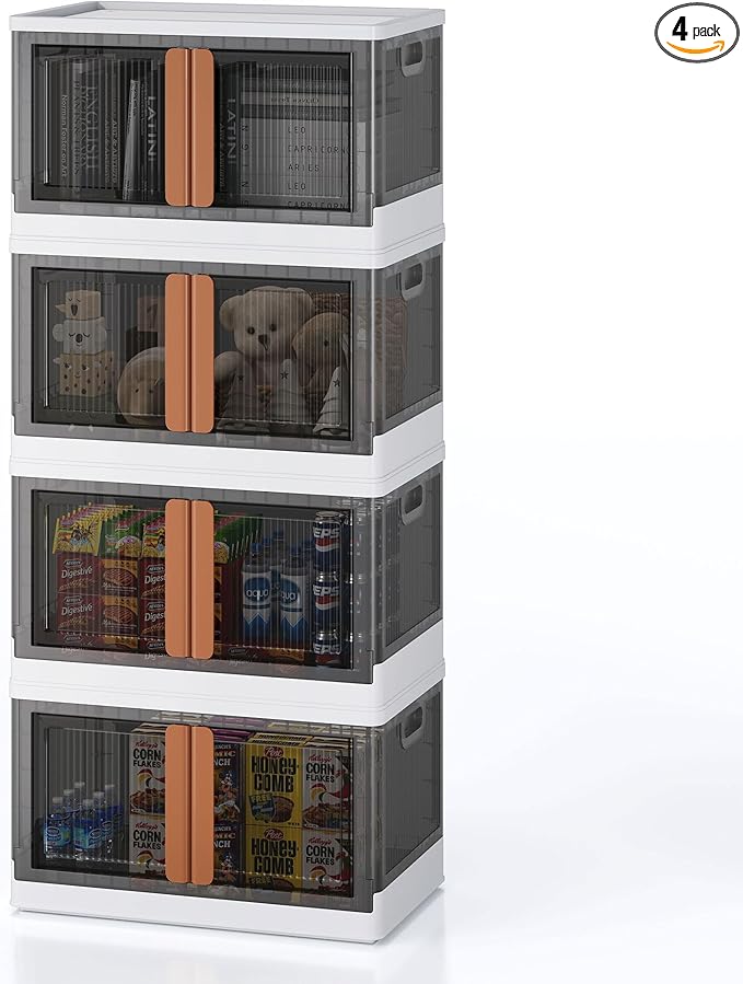 19Gal Collapsible Storage Bins with Lids & Wheels - 4 Pack Stackable with Doors, Heavy-Duty Plastic Containers for Home/Office, White