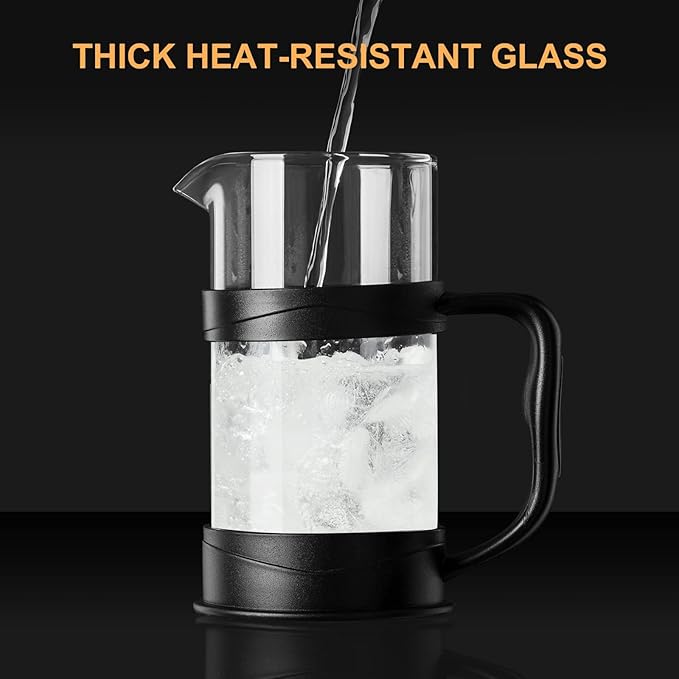 - 【Heat-Resistant Glass】This french press coffee maker is equipped with a heat-resistant borosilicate glass tumbler, a stylish PP frame that makes pouring coffee easier and prevents shaking.