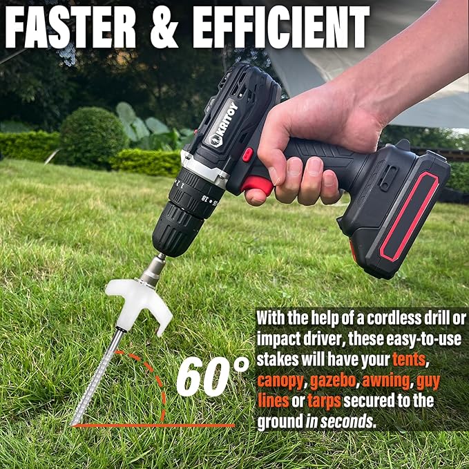 - 👍【EASY TO USE】Our Tent Stakes Setup faster so you can sit back with a beer while watching other campers struggle. With the help of a cordless drill or impact driver, these easy-to-use stakes will have your tents, canopy, gazebo, awning, guy lines or tarps secured to the ground in seconds.