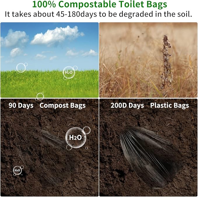 - 【 Biodegradable Material】Made from corn starch material, pure nature,can completely decompose in 60-180 day,then become a part of soil. It is best choose for outdoor activity such as camping, long car trips, boating, road trip or caravanning holiday, and are the perfect fit for camping toilet,travel potty,portable toilets or buckets.No worries about polluting the environment.