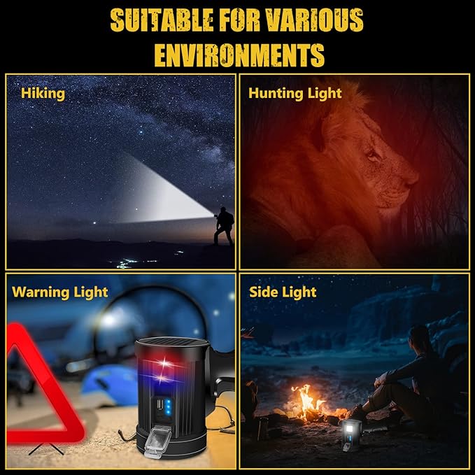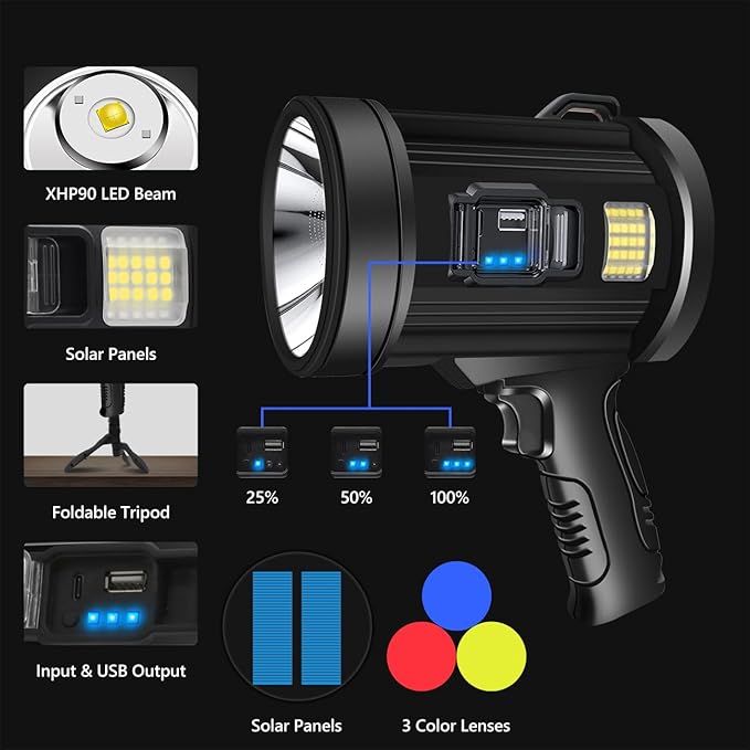 - Special Feature : Rechargeable: USB&Solar Charging, 100000 Lumen High Power, IPX6 Waterproof and Impact Resistant, Foldable Tripod, Long Range: 4921FT Rechargeable: USB&Solar Charging, 100000 Lumen High Power, IPX6 Waterproof and Impact Resistant, Foldable Tripod, Long Range: 4921FT