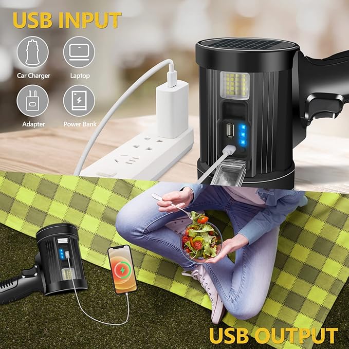 - BIG BATTERY POWER: This rechargeable spotlight comes with a hefty 12,000mAh battery that'll keep you going for over 12 hours straight. That means you can rely on it for those long outdoor adventures. And when it's time to juice it up, you can plug it into a USB wall charger, a USB car charger (takes about 4-5 hours), or even soak up some sun and charge it with solar power (around 10-20 hours).
