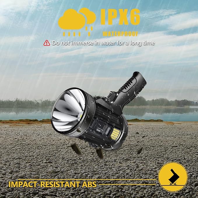 - WATERPROOFING: This handheld spotlight is rated IPX6 waterproof, meaning it can handle splashes from any direction. Perfect for outdoor adventures and tackling all sorts of nasty weather conditions.