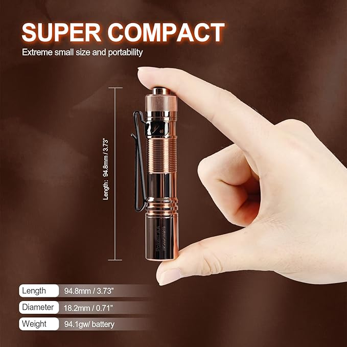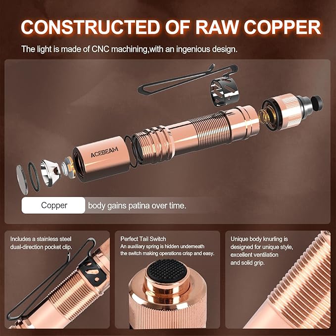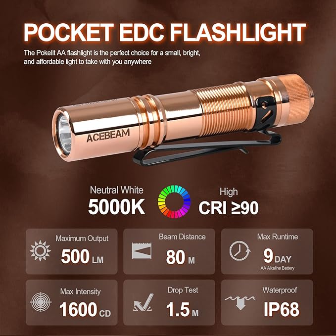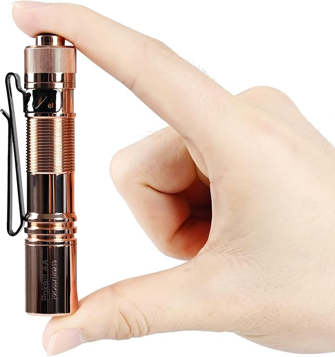 - Sturdy Flashlight: The Pokelit AA Copper edc flashlight with pinkish-red hue of copper will certainly make your gear stand out, and as it ages it will develop a beautiful patina that adds a touch of class to your ensemble. its IP68 water resistance and 1.5 meters impact resistance make the small flashlight endure rough handling and harsh weather.