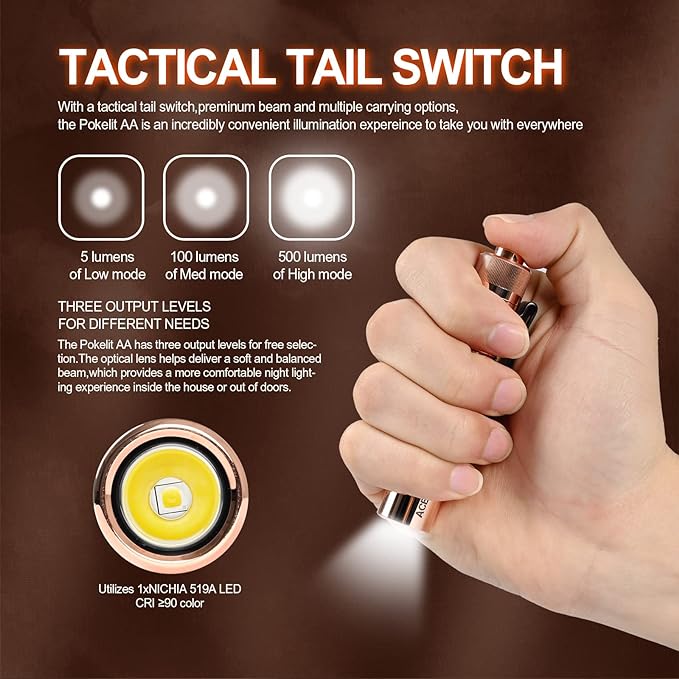 - High Performance Flashlight:Pokelit AA Copper pocket flashlight emits bright light up to 500 high lumens. Featured with 3 light modes: High / Medium / Low (Without memory function), running time up to 58 hours,perfectly meet the various needs of daily use, Pokelit AA will be your perfect companion.