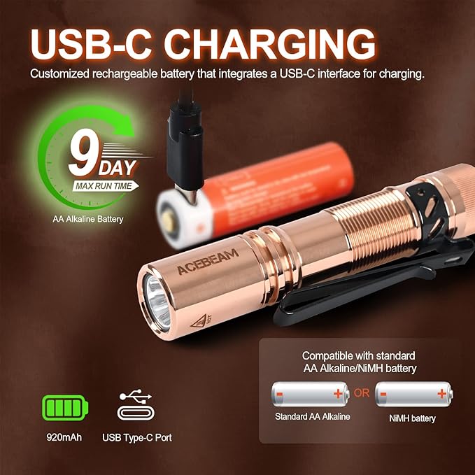 ACEBEAM Pokelit AA Rechargeable Mini Flashlight with Clip, 500 High Lumens Pocket EDC Flashlight, Super Bright Small Flashlight,519A 90+ High CRI Led Flashlight for Camping,Hiking,Everyday Use(Copper)