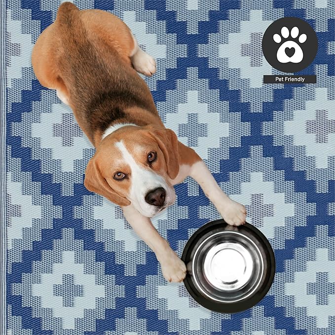 FH Home Outdoor Camping Rug - Waterproof, Fade Resistant, Reversible - Premium Recycled Plastic - Geometric - Large Patio, Deck, Sunroom, RV - Aztec Kilim - Blue Multi - 9 x 12 ft Foldable