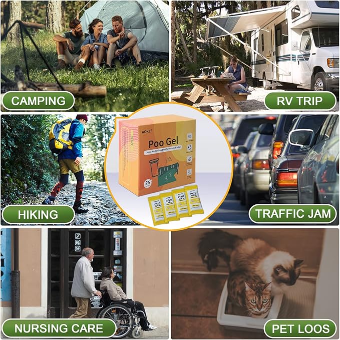 - [WIDE APPLICATION] Poo absorbent powder widely use for camping toilet bags,portable potty bags, and other liquid waste in compost bags, portable potty bags, wag bags, urine bags, toilet bags, luggable loo bags, nursing emergency bag for portable toiletet bucket, porta potty, camping toilet, and emergency toilet, etc.Also for camping, hiking, boating, fishing, beach, RV trip, long road trips, outdoor shower tents, camping showers, home care, school, hospital, nursing homes,emergency gear, etc