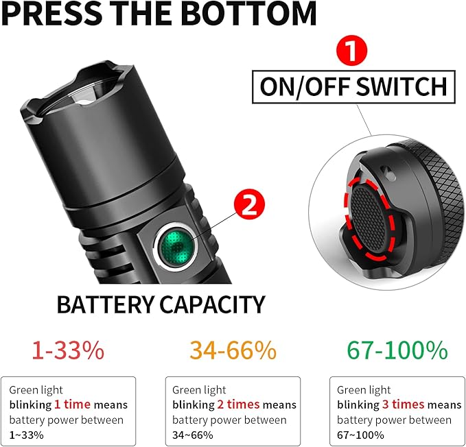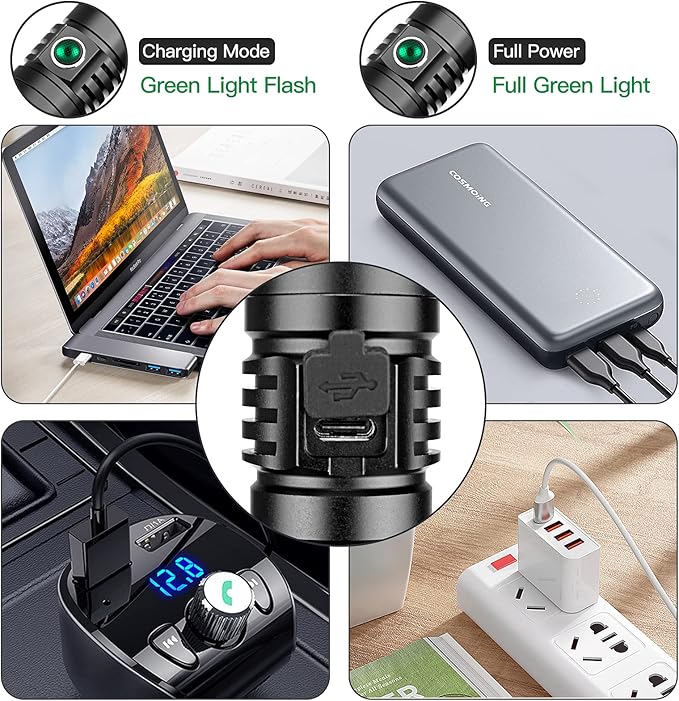 - 【TYPE-C RECHARGEABLE】Recharge the handheld flashlight through any USB port, such as computer, powerbank or in the car. Use rechargeable battery save lots of battery cost and environmental friendly.