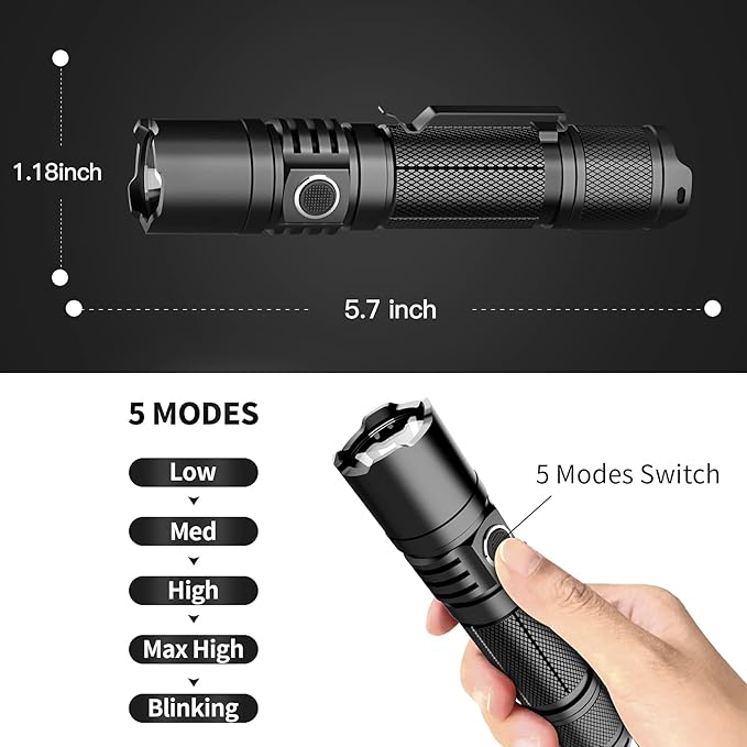 - 【ADJUSTABLE 4 MODES】4 Useful Settings with this tactical flashlight (On/High/Med/Strobe) makes it ideal for user to walk around the house, dog walking, hiking or camping, repairing car and night riding, emergency use,etc.