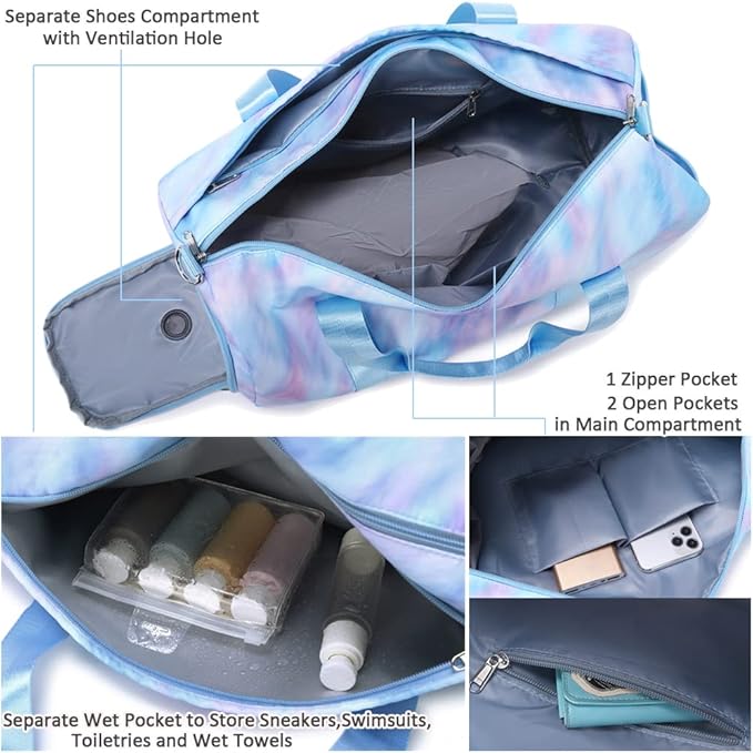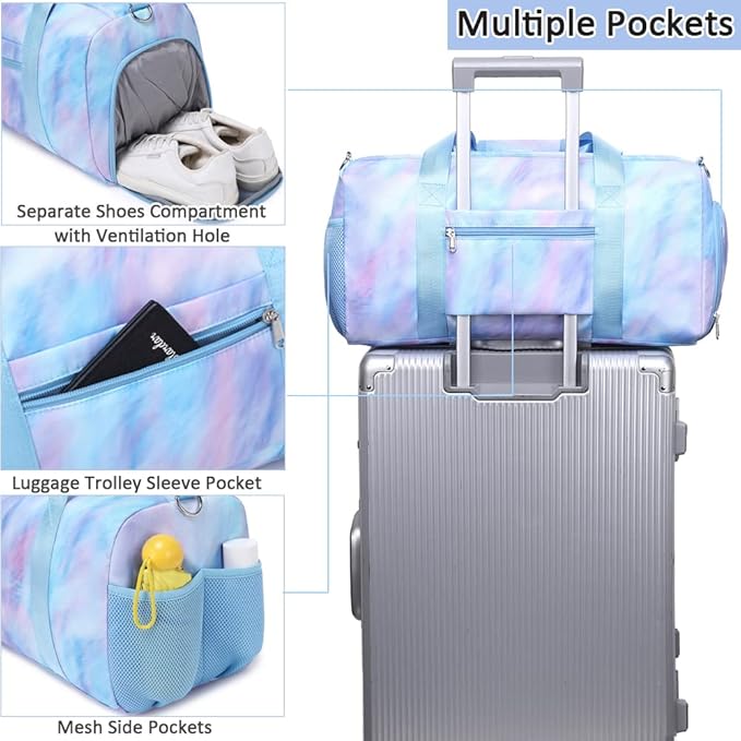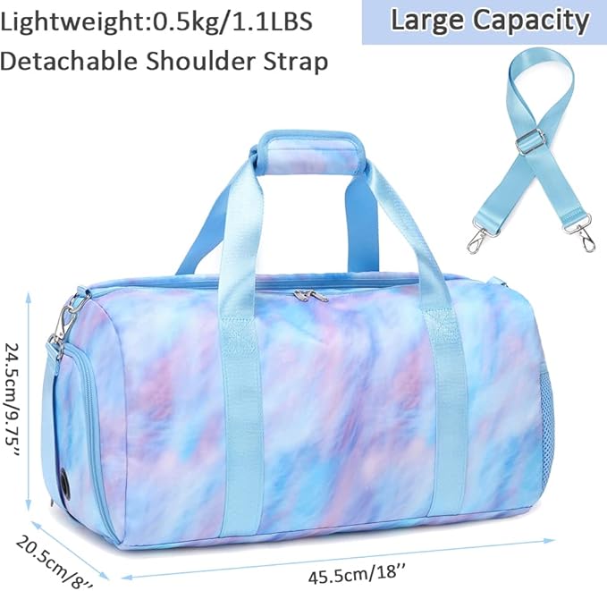 - Duffel Bag for Girls Large Capacity and Multi Compartments - Teen Girls Overnight Bag Size: 18”L*9.75”H*8”W. 1 main compartment with 1 inner zipper pocket, 2 interior open pockets, 1 large PVC wet seperated compartment, 2 Mesh side pockets,1 trolley sleeve pocket and 1 separate shoe compartment with ventilation, 1 adjustable long shoulder straps with metal hooks.