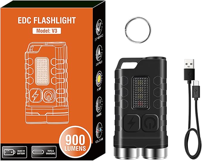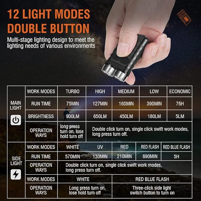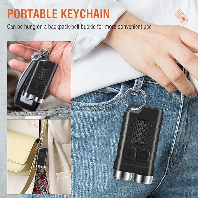 - 【12 Lighting Modes】: With 5 modes for the main light (super bright, high light, medium bright, low light, economic) and 7 modes for the side light (white light, UV, red light, red light flash, red-blue light flash), this small keychain flashlight can meet your various lighting requirements. It provides sufficient brightness for daily use, even in low-light mode.